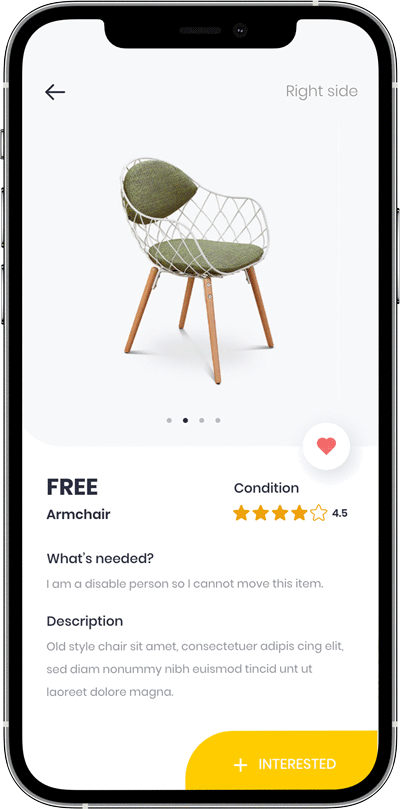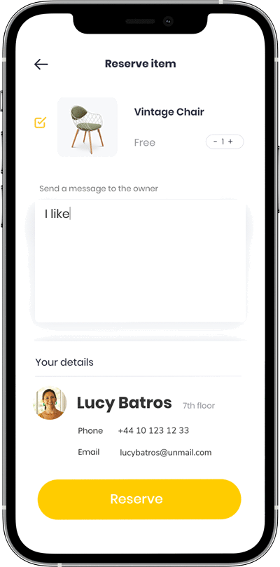 When user select the item would have access to all its information provided by the owner.The owner will be able to express if he needs any help regarding to the item. After hiting the Interested button, he will be also able to send a message to the owner. Both layouts are made to facilitate conversation between them.