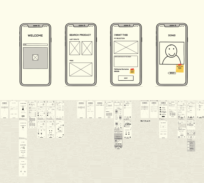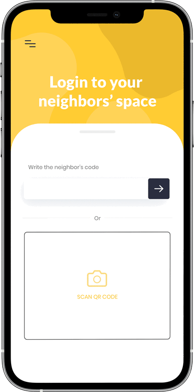 The first screen allows the user to enter into the neighbors' space by introducing its code or scanning a QR code. A QR code would generate more adhesion since it can be displayed anywhere in the building, like in the elevator or notice board. The second screen includes in the viewport the last minute section and a special section for free stuff in order to highlight them in between paid items.